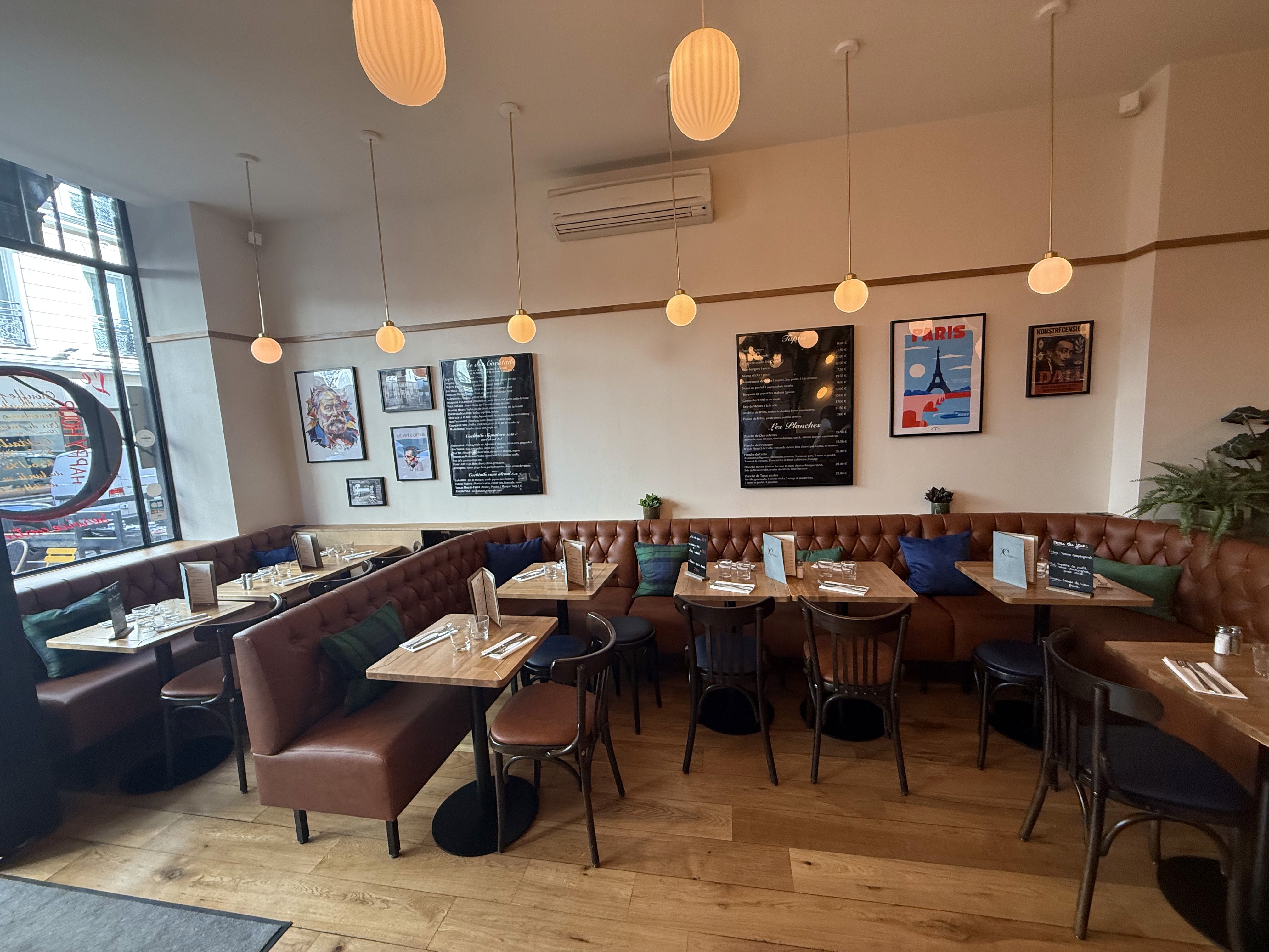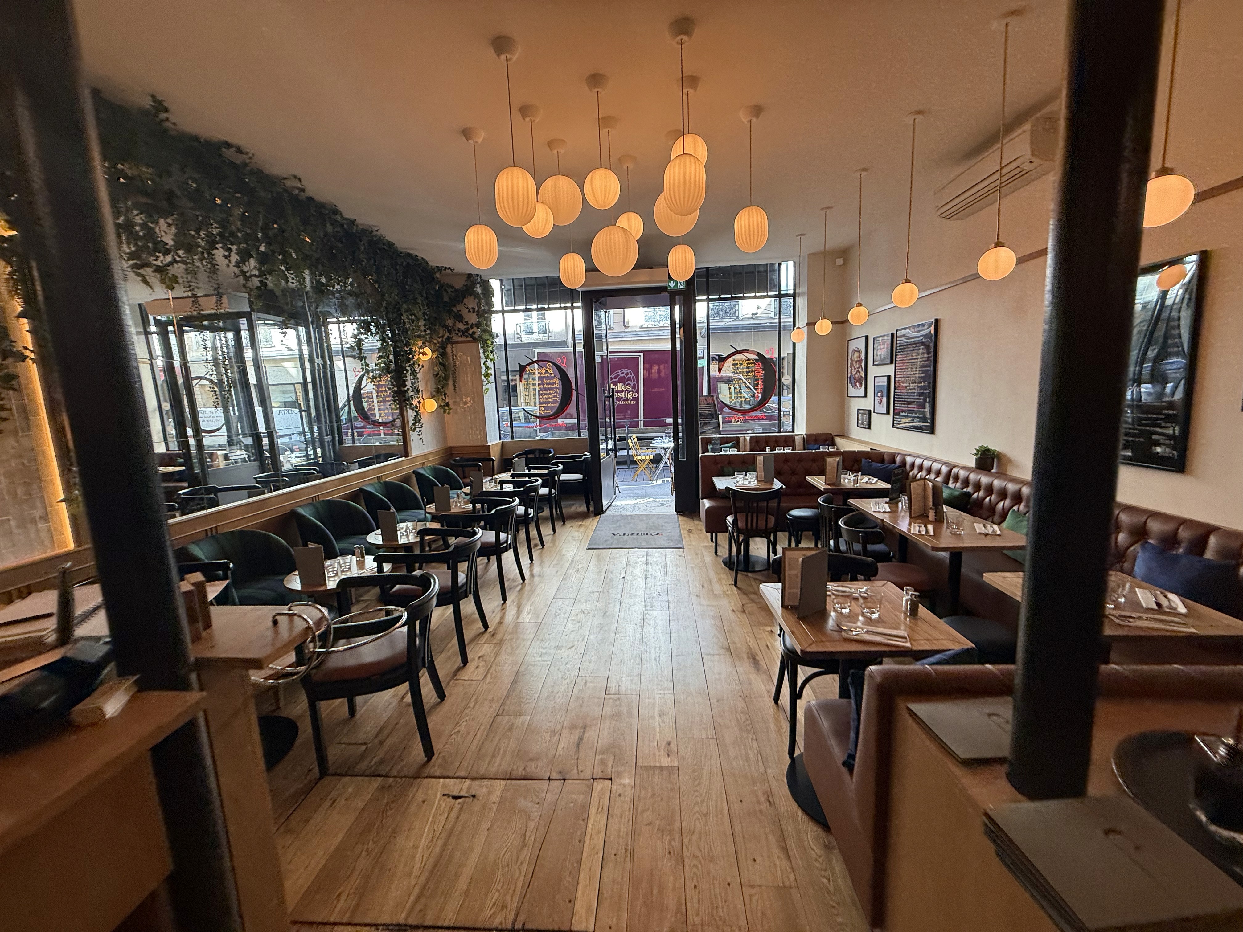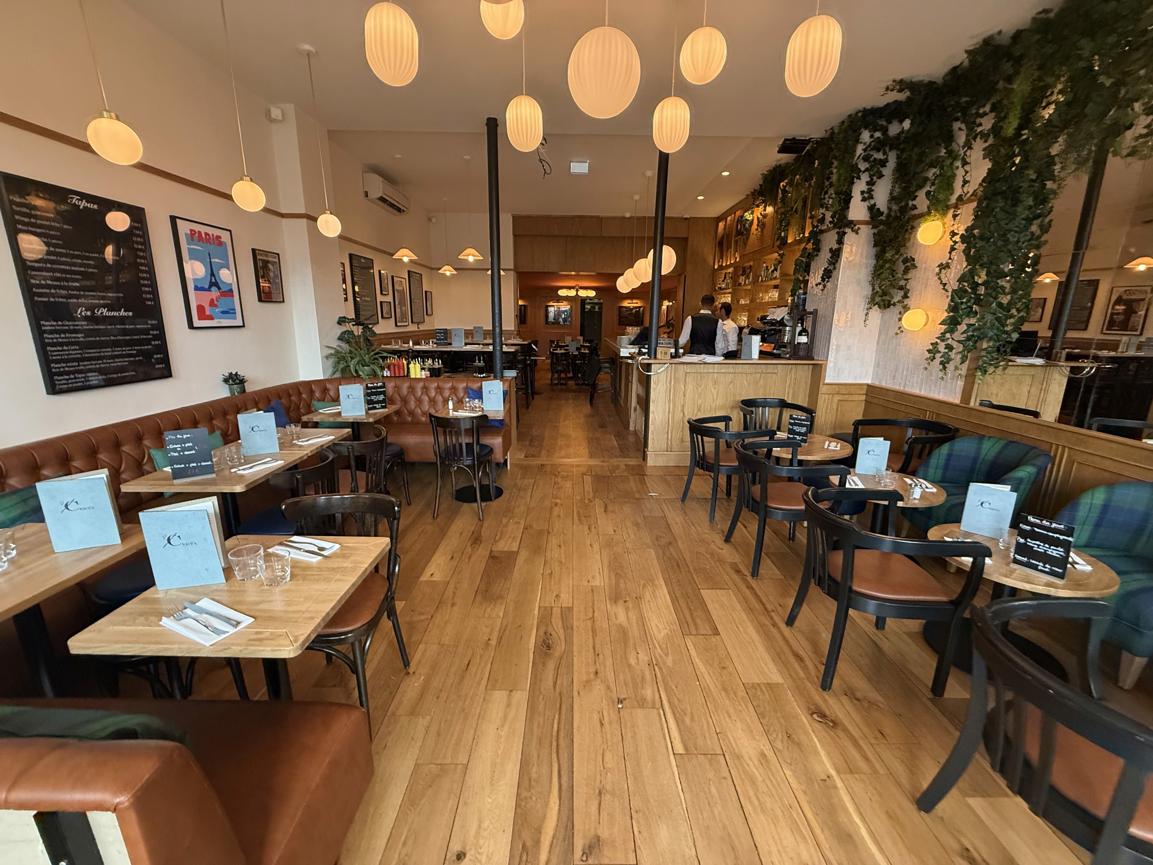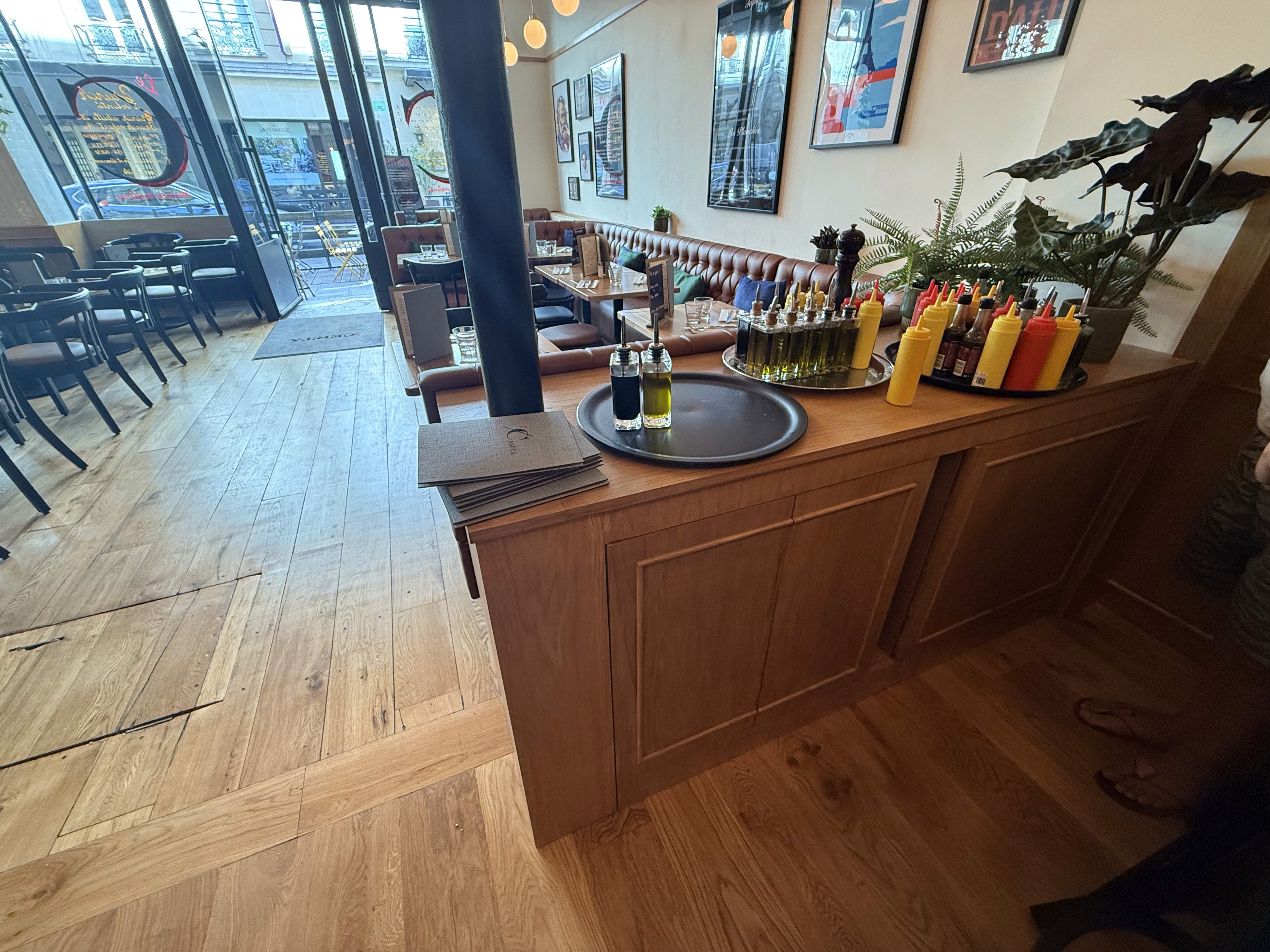 Les travaux ont intégré la pose d’un parquet en bois clair sur l’ensemble de la surface, apportant chaleur et homogénéité à chaque zone du restaurant. Les espaces ont été repensés pour délimiter clairement le bar, les zones de repas en tables hautes et les coins plus intimistes. L’éclairage a été particulièrement travaillé : suspensions design, appliques murales et luminaires intégrés créent une ambiance douce et accueillante.