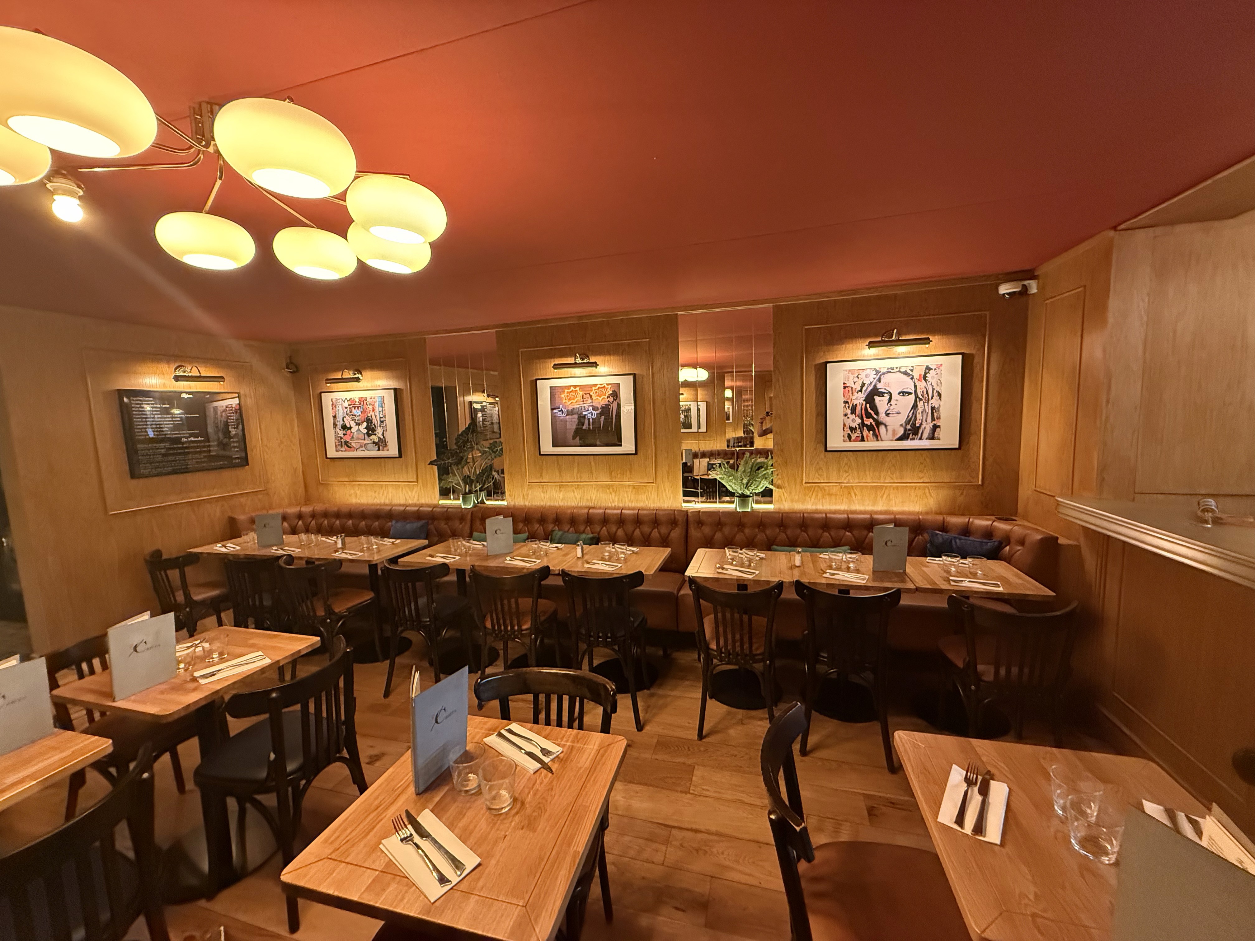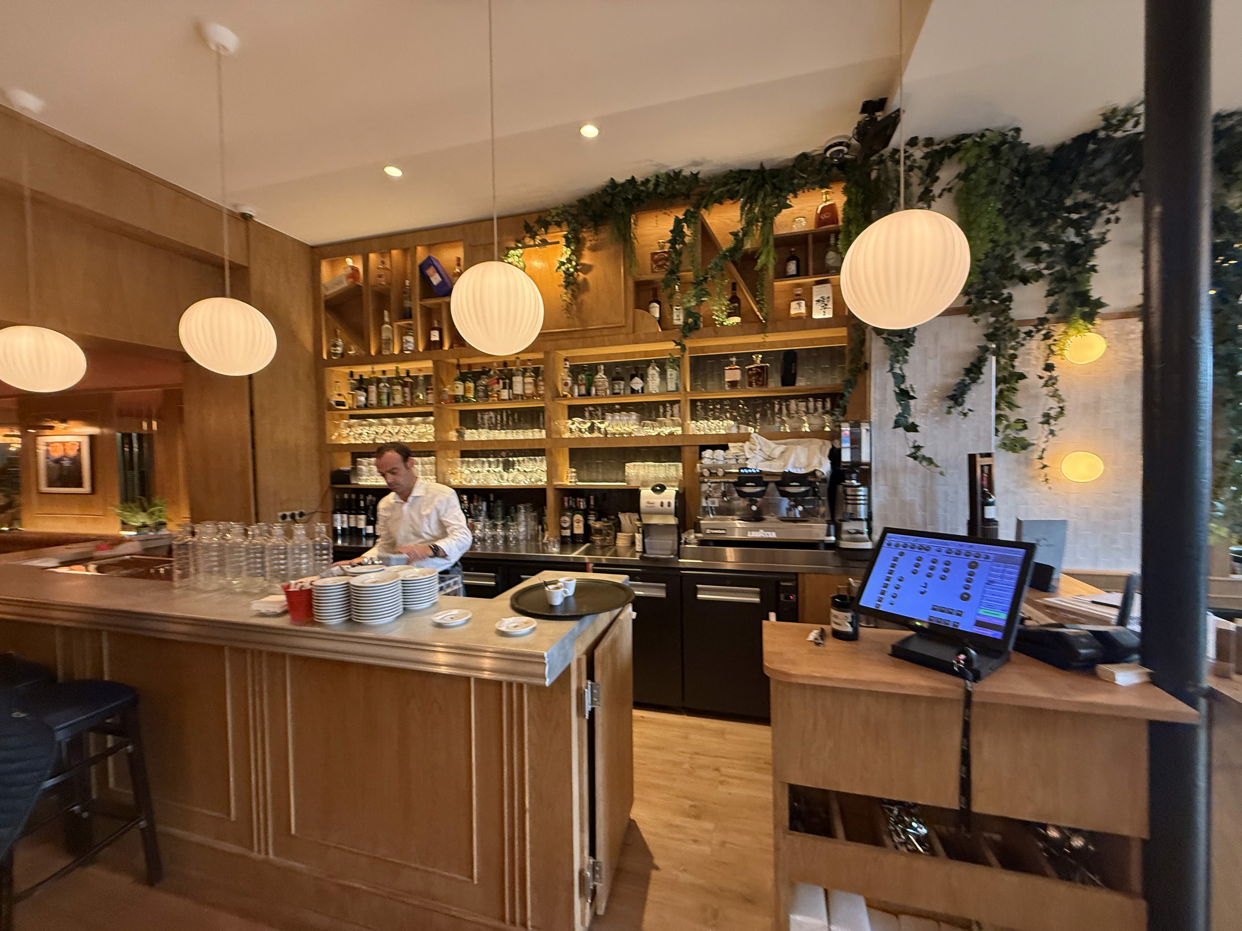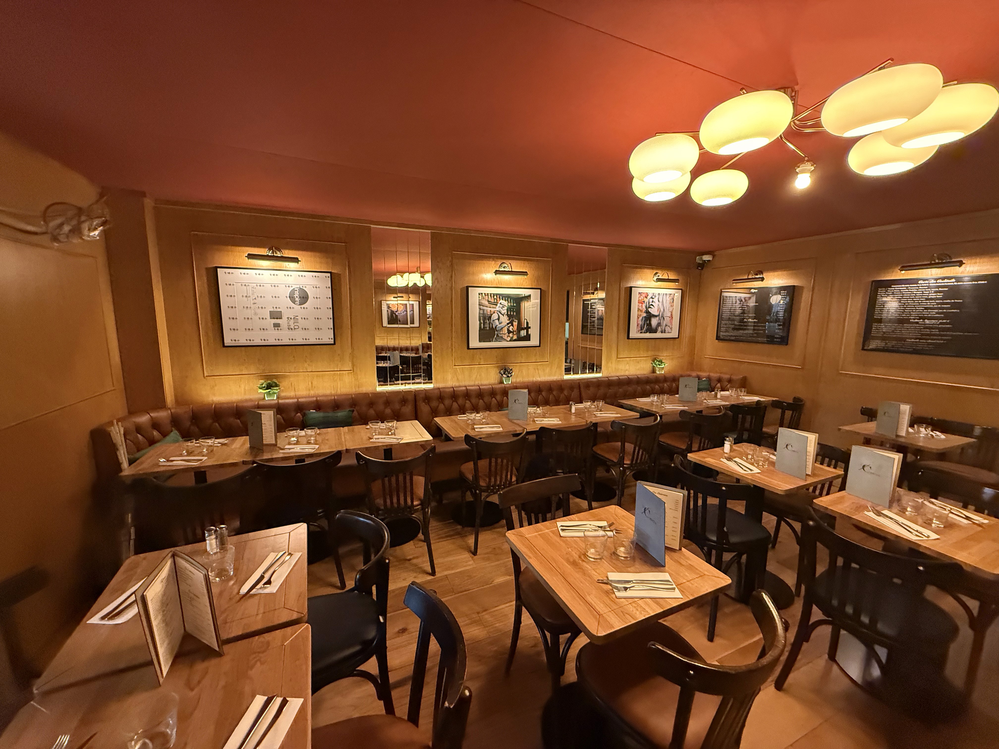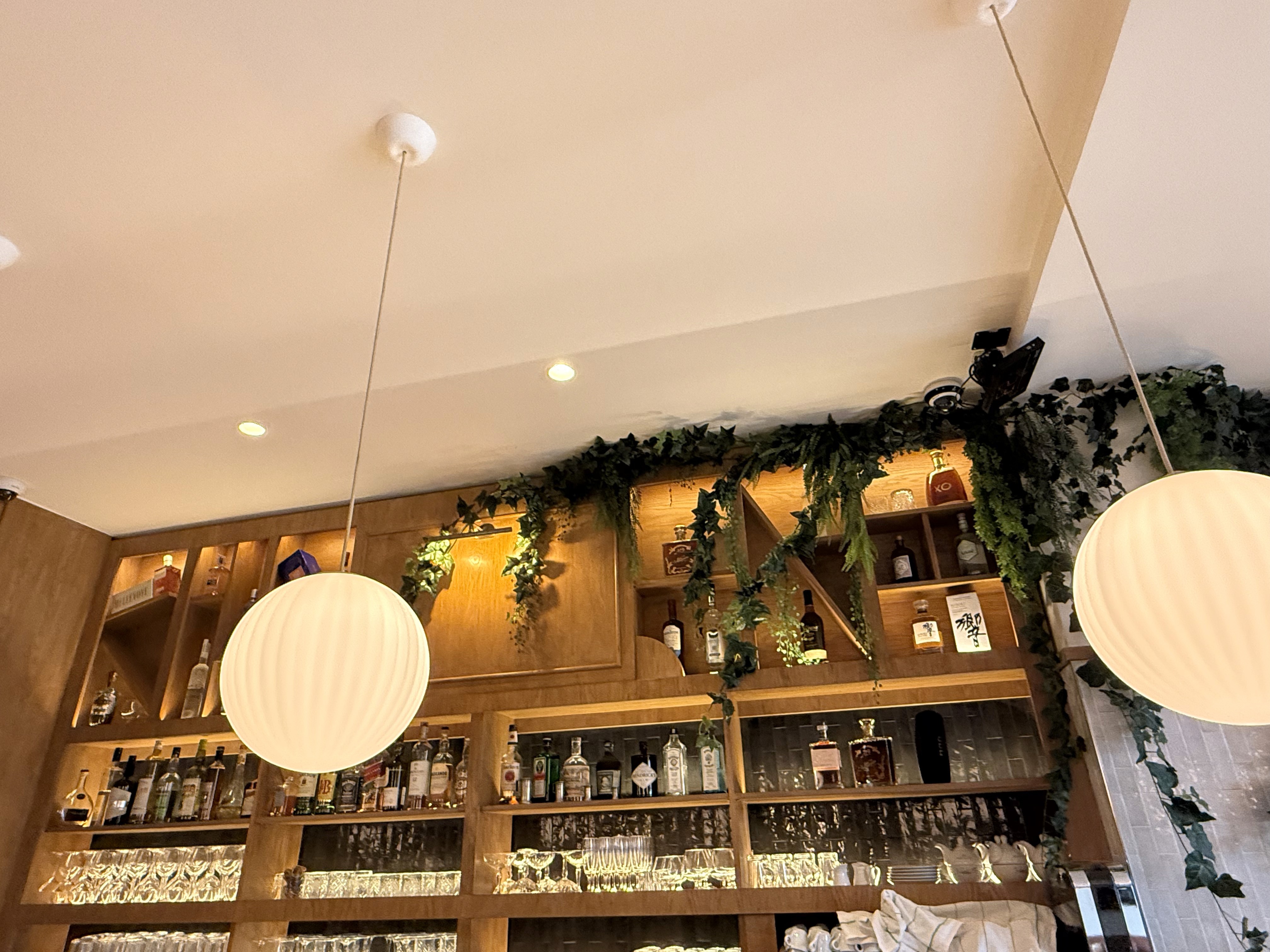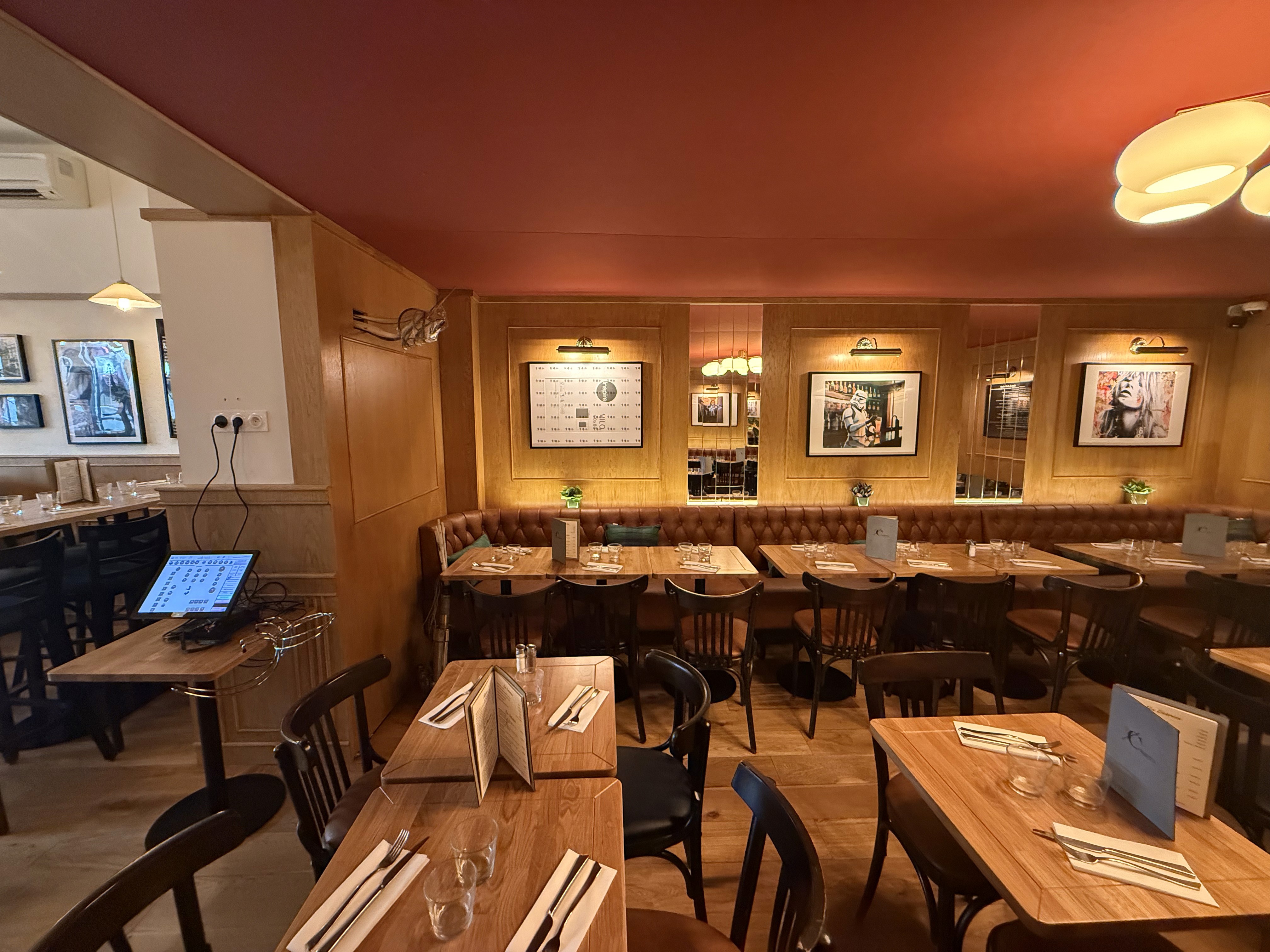 Les travaux ont intégré la pose d’un parquet en bois clair sur l’ensemble de la surface, apportant chaleur et homogénéité à chaque zone du restaurant. Les espaces ont été repensés pour délimiter clairement le bar, les zones de repas en tables hautes et les coins plus intimistes. L’éclairage a été particulièrement travaillé : suspensions design, appliques murales et luminaires intégrés créent une ambiance douce et accueillante.