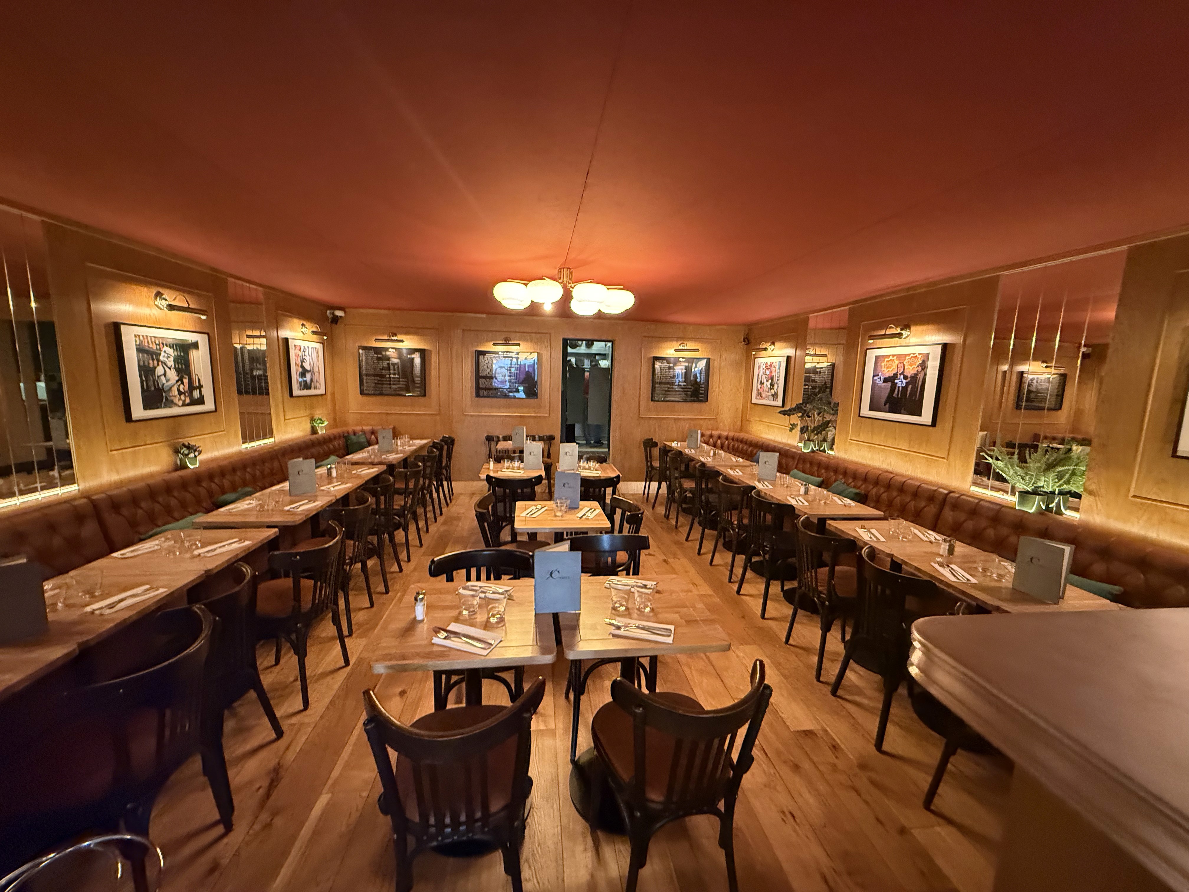 La rénovation a inclus la création d’un bar sur mesure avec étagères rétro-éclairées pour mettre en valeur la sélection de boissons, l’installation de miroirs muraux agrandissant visuellement l’espace, ainsi que l’intégration de touches végétales apportant fraîcheur et modernité. Les assises en cuir et en velours ont été choisies pour allier confort et esthétique, tandis que les systèmes de climatisation et d’éclairage ont été modernisés pour répondre aux exigences actuelles d’un établissement parisien haut de gamme.