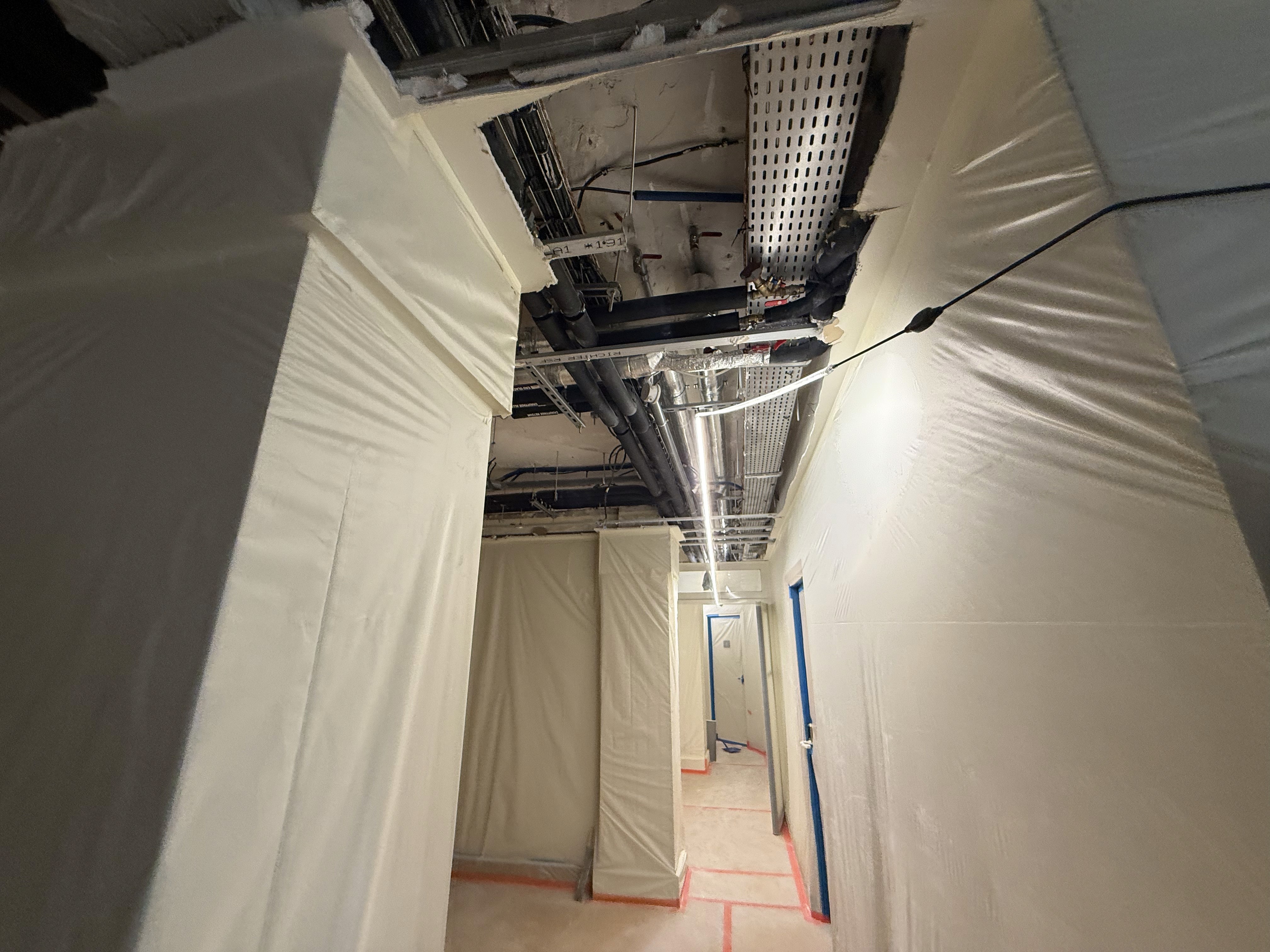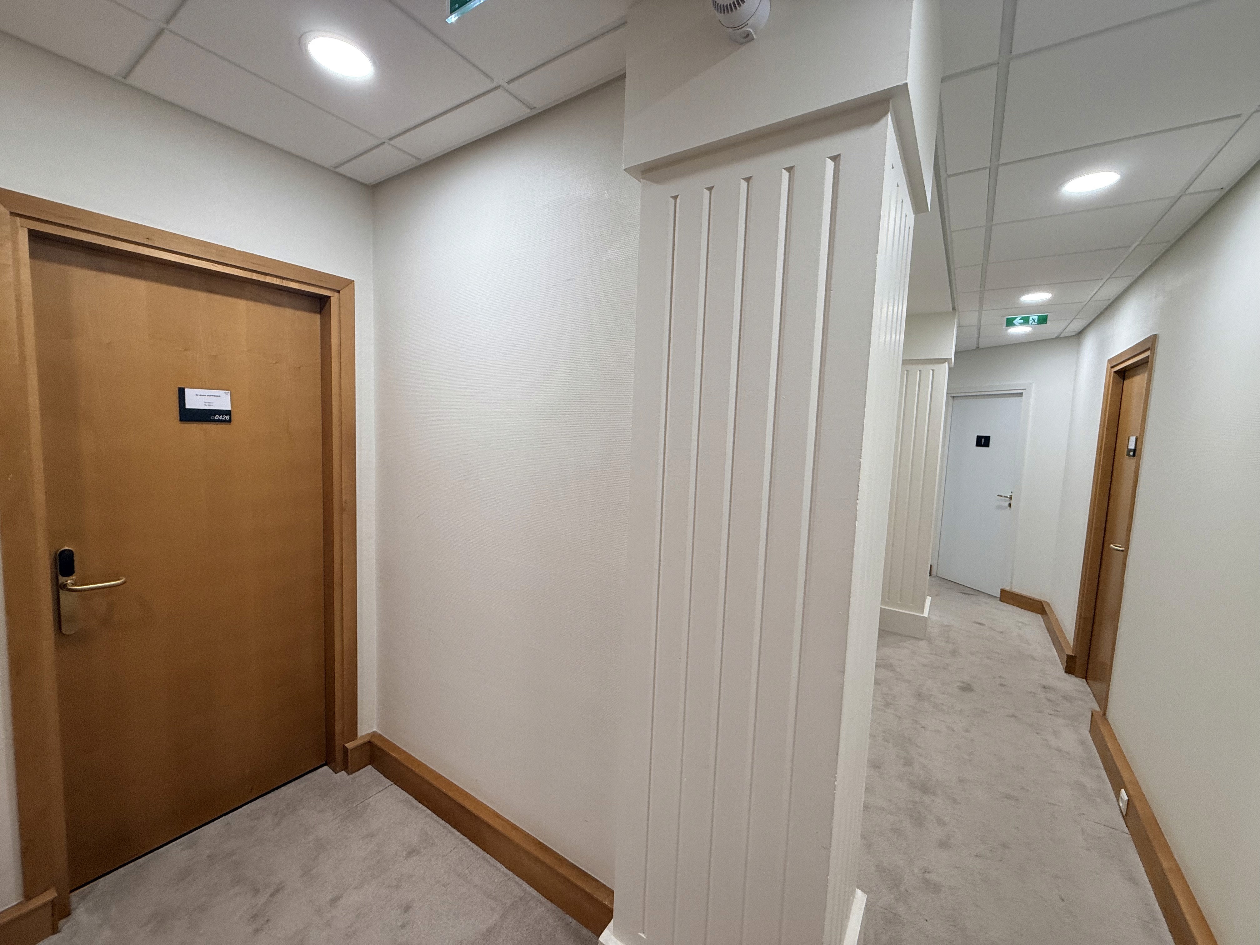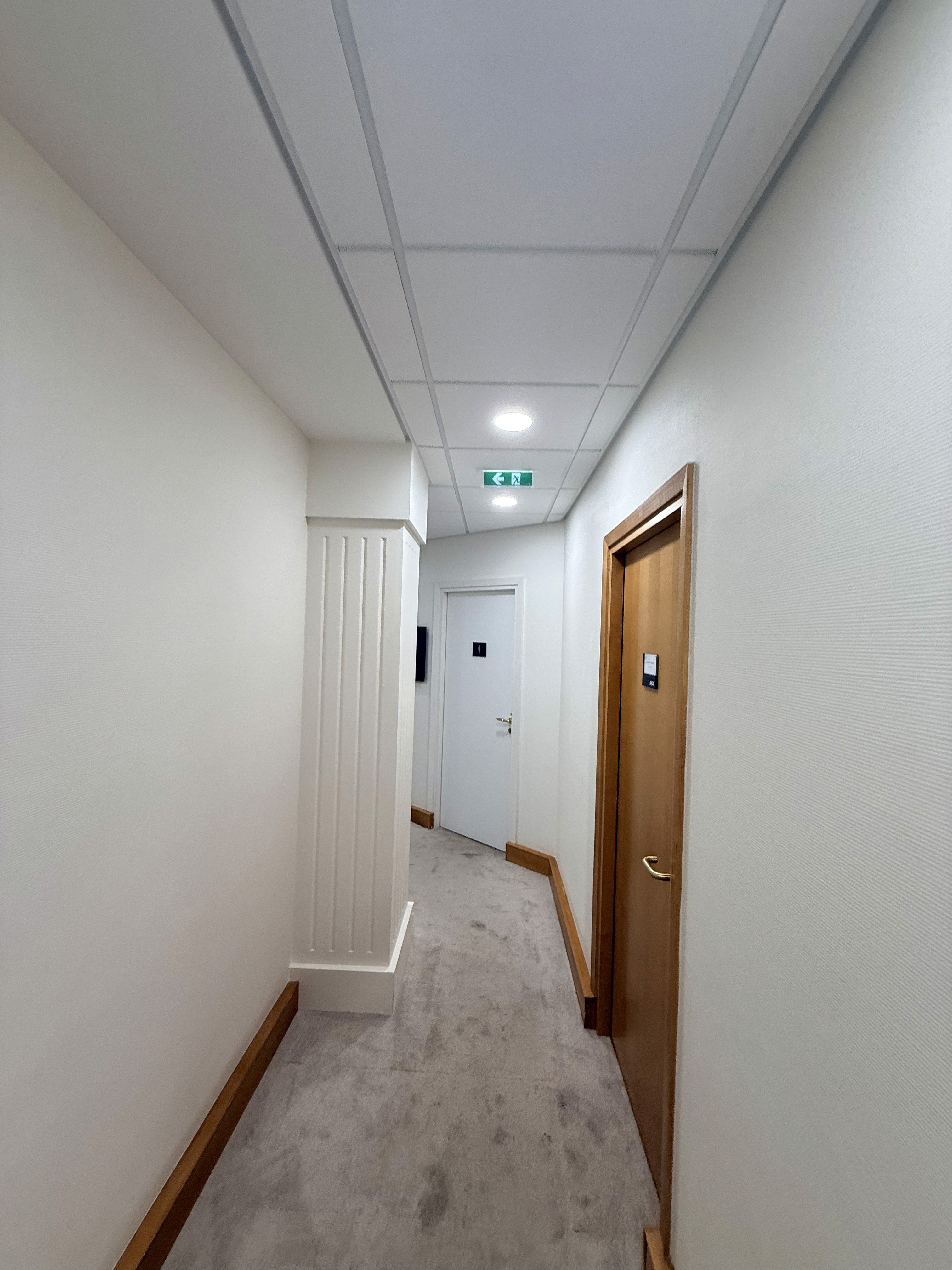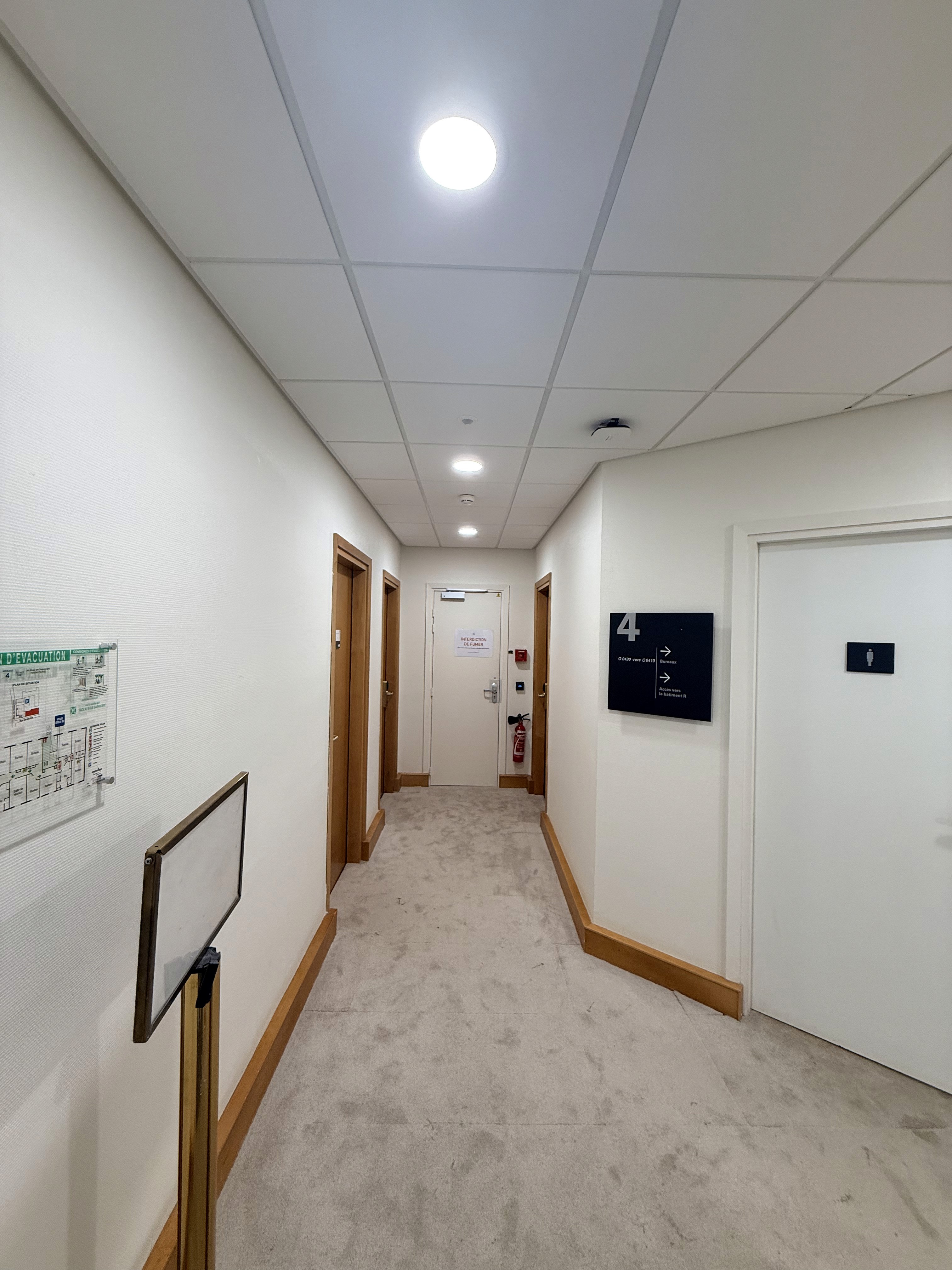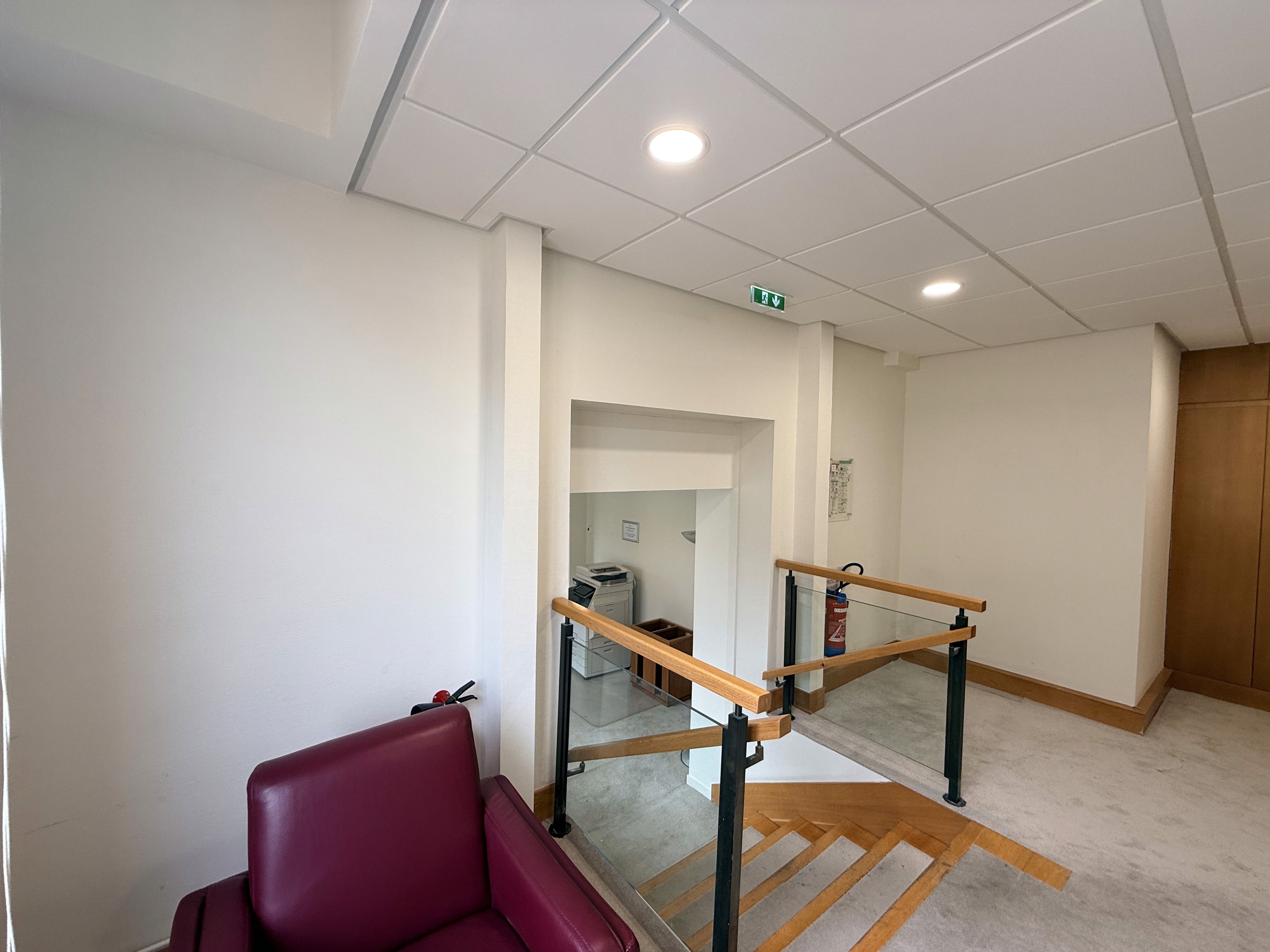 La première étape a consisté en la préparation des supports et la dépose des éléments existants devant être remplacés, avec une gestion soignée des protections et un contrôle rigoureux de la propreté des zones de travail. Les parois et plafonds ont ensuite été repris pour garantir des surfaces homogènes et prêtes à recevoir des finitions adaptées aux contraintes d’un bâtiment recevant du public. Les travaux ont été complétés par la remise en état des revêtements et des éléments de circulation, afin d’obtenir un ensemble cohérent, sobre et durable, en accord avec l’esthétique des lieux.